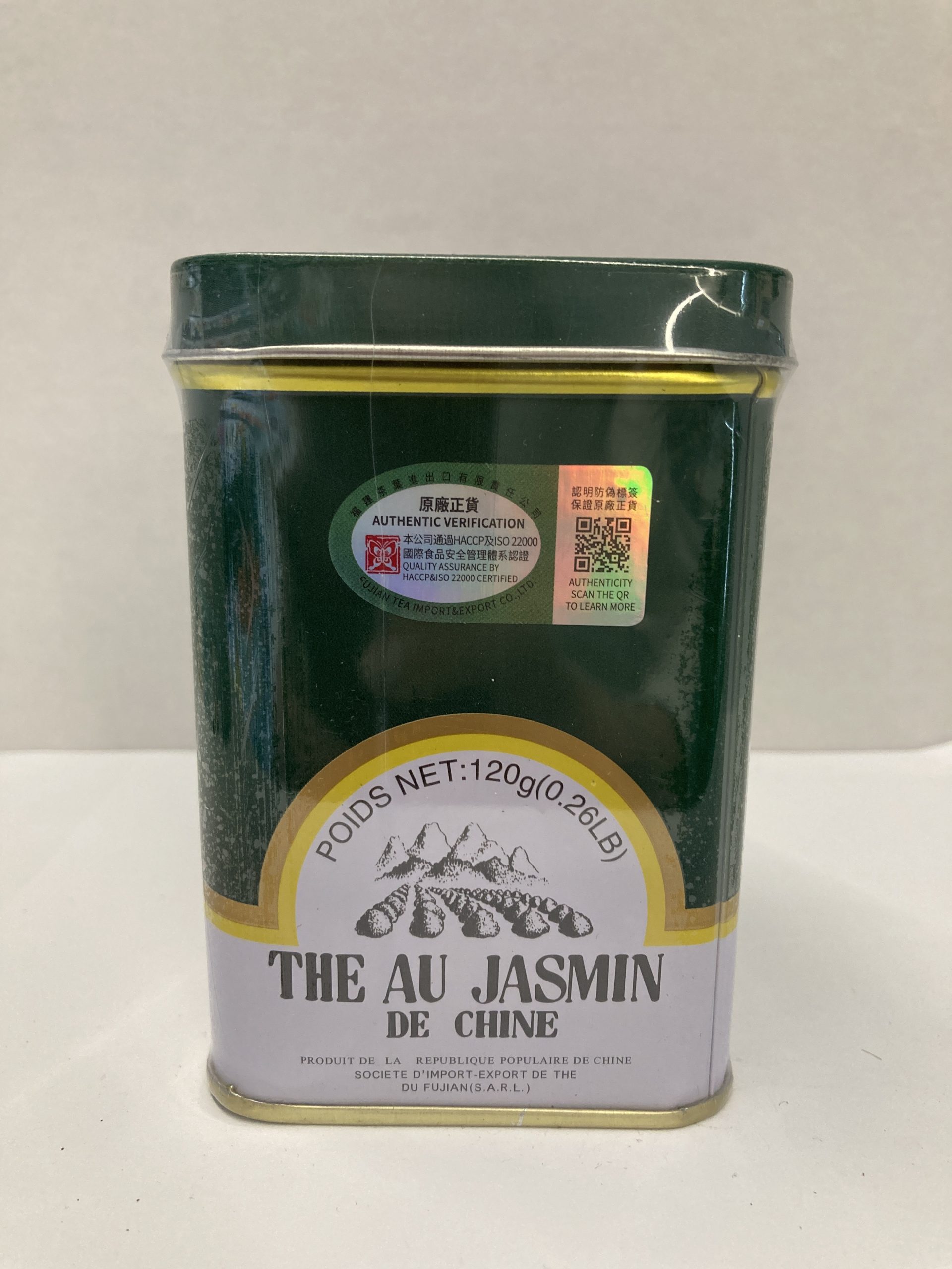 Kiváló minőségű, jázminvirággal aromásított zöld tea, szálas kiszerelésben, fém dobozban.