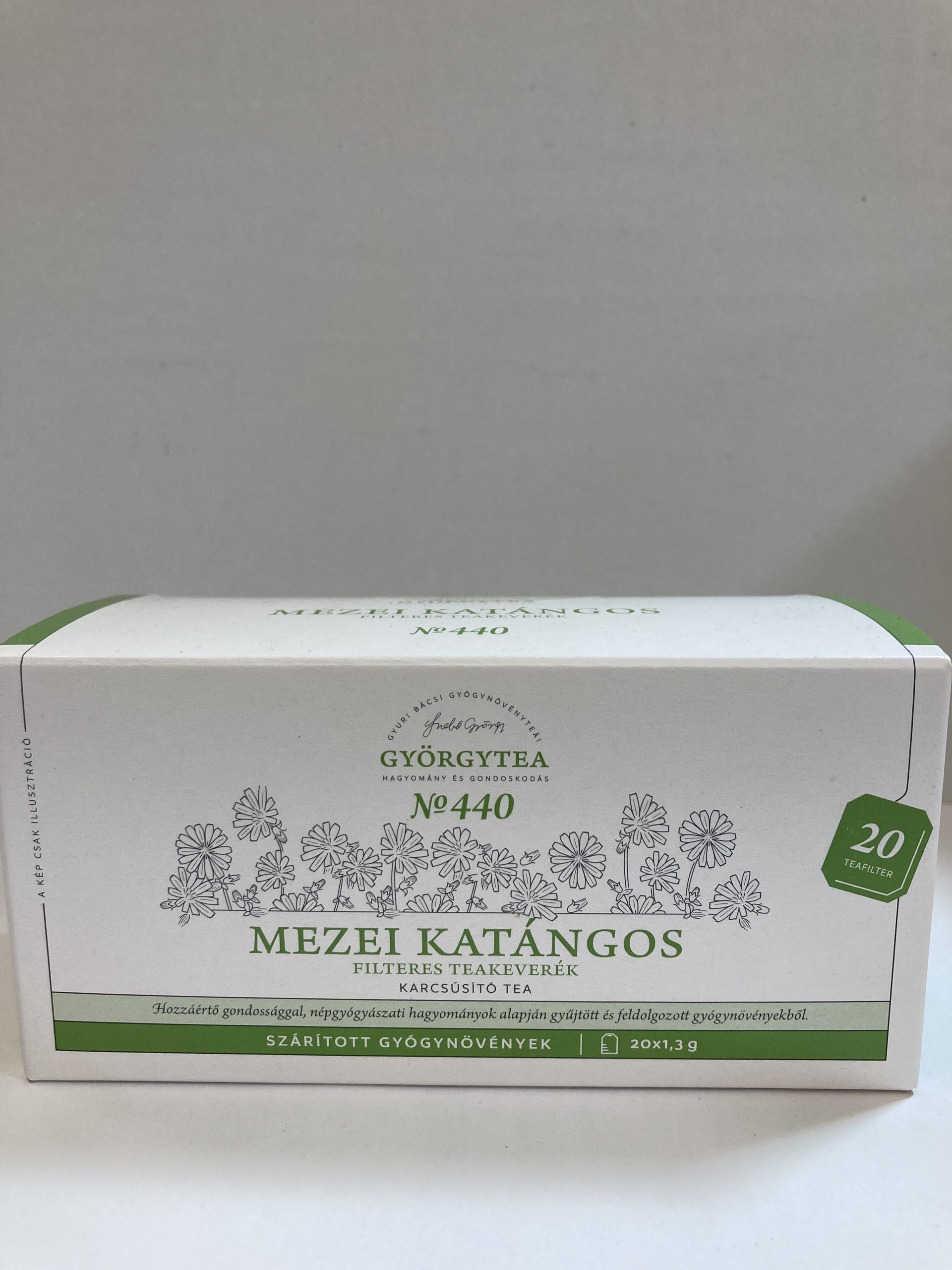 A Györgytea mezeikatángos filteres teakeverék egy karcsúsító teakeverék, amely a mezei katángot (vadcikória) tartalmazza, és segíthet az emésztés serkentésében, a máj és vese tisztításában, a felesleges víz elhajtásában, és a testsúly csökkentésében. A teakeverék filteres formában kapható, egy dobozban 20 filter található, és a Györgytea weboldalán, valamint a forgalmazóknál is elérhető.