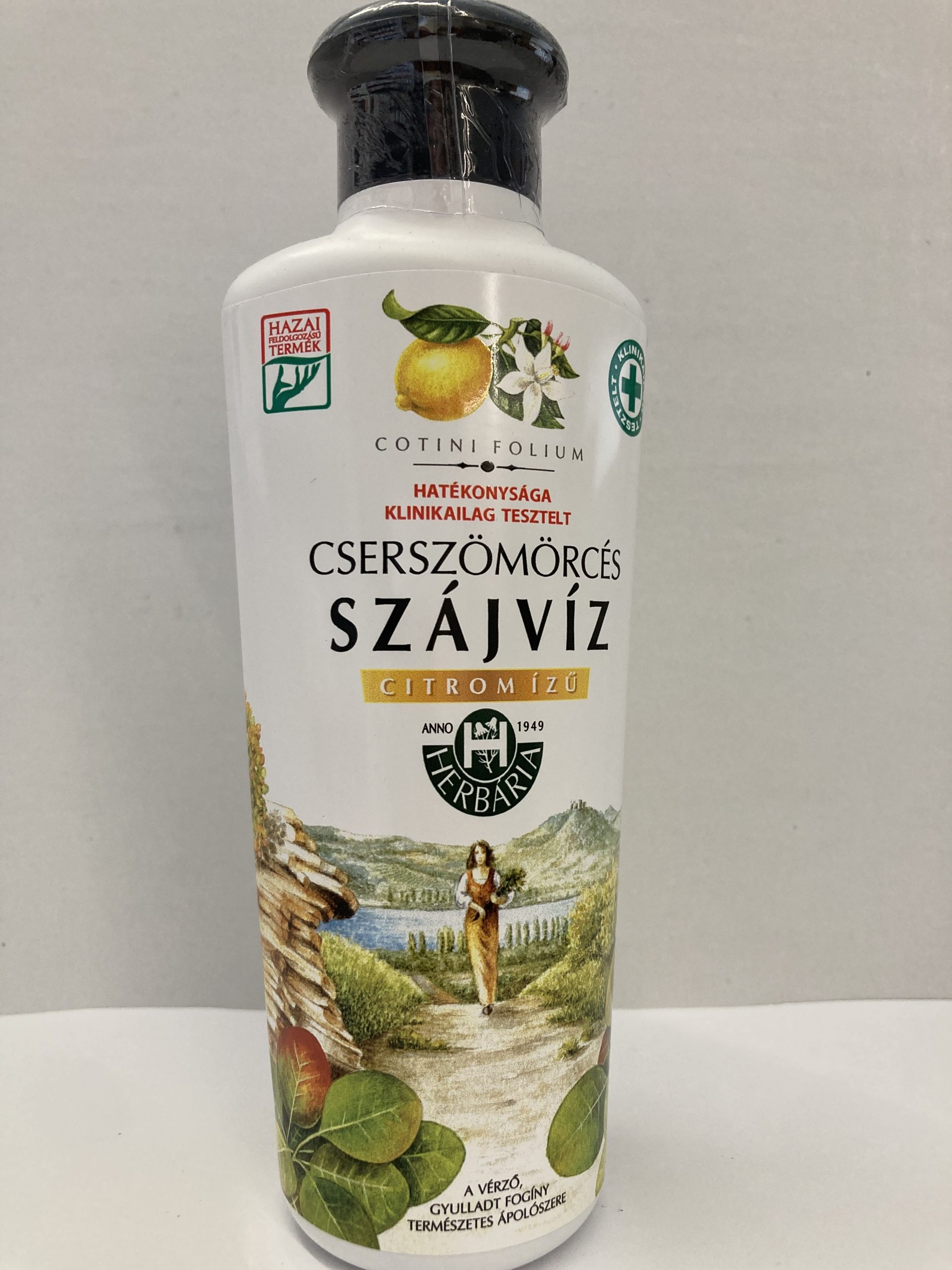 A Herbária cserszömörcés citromos szájvíz cserszömörce és kakukkfű kivonatát tartalmazó szájápoló, amely csökkenti a fogíny gyulladását és vérzését, valamint fertőtlenítő és frissítő hatású. A benne lévő csersav jelentős összehúzó hatást fejt ki, a kakukkfű pedig fertőtlenít, mindez pedig segít megelőzni a fogágybetegségeket és a szájnyálkahártya-gyulladásokat. Használata javasolt a fogmosás kiegészítéseként a kellemes, friss lehelet érdekében.