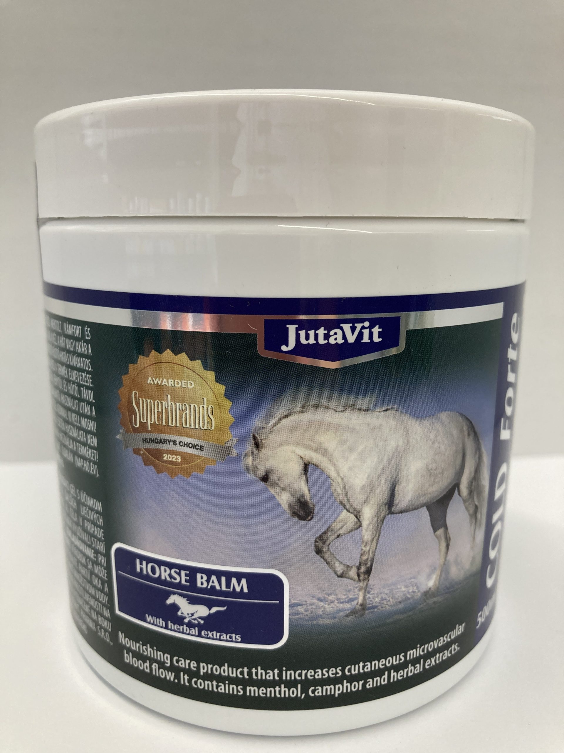 JutaVit Lóbalzsam COLD 500ml – Vérbőséget okozó mentolt, kámfort és gyógynövény kivonatot tartalmazó ápoló készítmény.