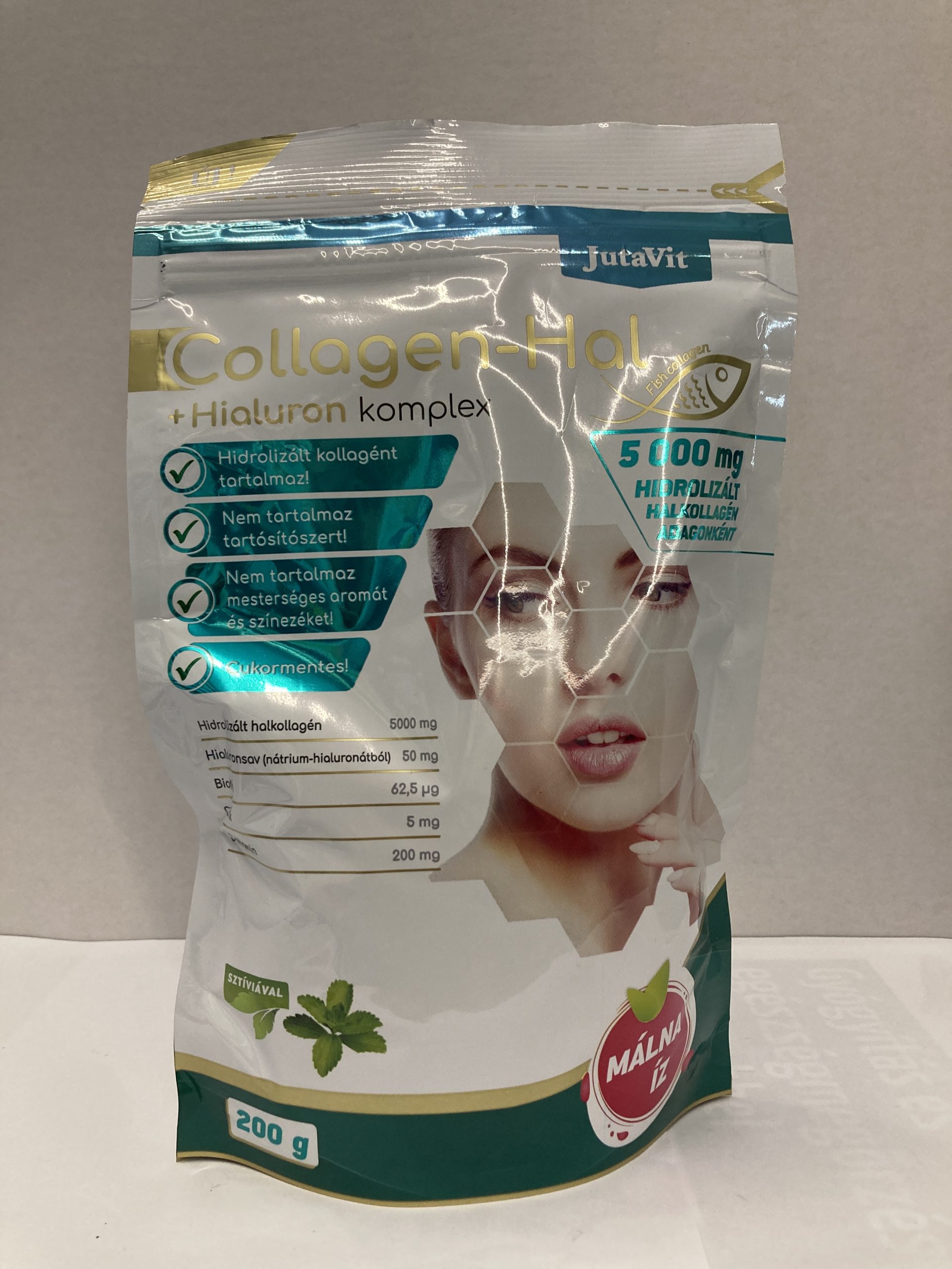 A JutaVit málna ízű Collagen-Hal + Hialuron komplex étrend-kiegészítő hidrolizált halkollagént, hialuronsavat, biotint, szerves cinket és C-vitamint tartalmaz. A kollagén a bőrszövet egyik természetes alkotóeleme. A termékben található kollagén, nagy tisztaságú, természetes halkollagén peptidből készül. A hialuronsav az emberi szervezetben is előforduló, nagy vízmegkötő képességgel rendelkező poliszacharid, amely megtalálható többek között a bőrszövetben is. A C-vitamin hozzájárul a megfelelő kollagénképződéshez és ezen keresztül a bőr, a fogak, a csontozat, a porcok és a fogíny normál állapotának és működésének fenntartásához. A biotin és a cink hozzájárul a bőr és a haj normál állapotának megőrzéséhez. A cink hozzájárul a normál csontozat és körmök fenntartásához. A termék kizárólag szerves kötésű, jól hasznosuló cink-glükonátot tartalmaz. A cink-glükonátból származó szerves cink jobb hasznosulással rendelkezik, mint a szervetlen (cink-oxid) vegyületek.