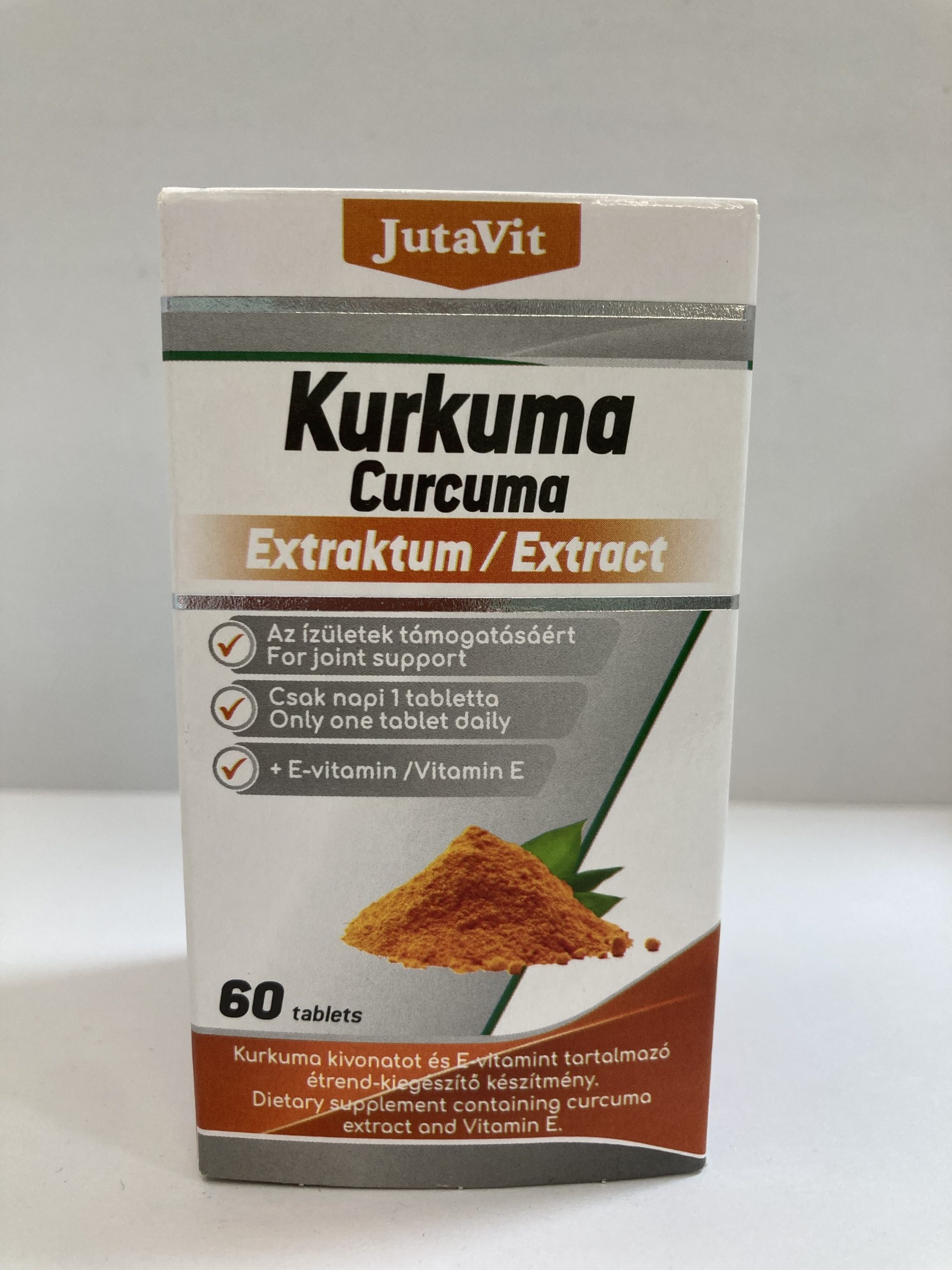 A JutaVit készítménye más termékekkel szemben nem a kurkuma porított változatát tartalmazza, hanem annak kivonatát, amely a növény értékes részének 50-szeres koncentrátuma. Antioxidáns hatású E-vitaminnal kiegészített.