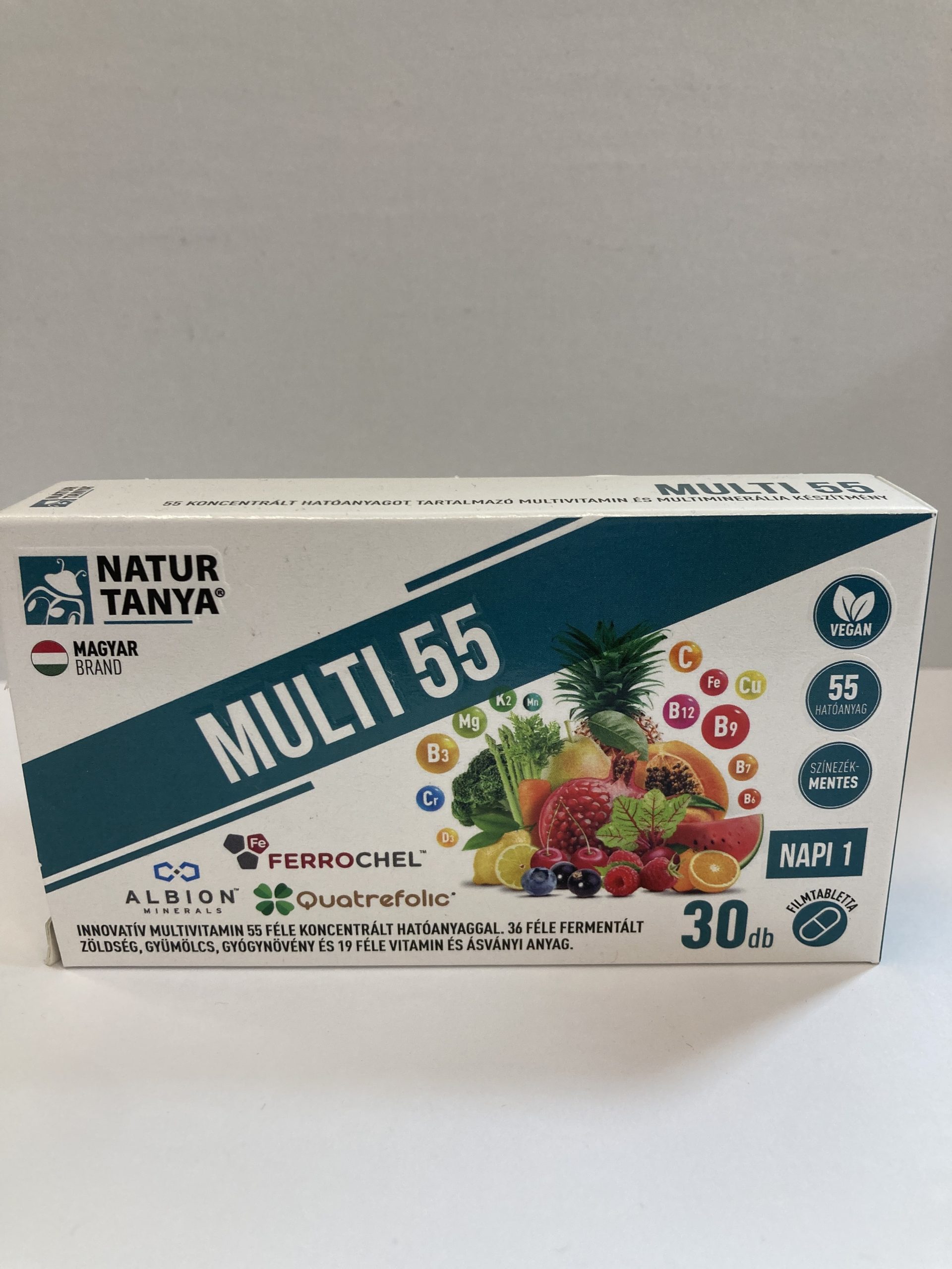 A Natur Tanya® Multi 55 tudatosan fejlesztett, fermentált multivitamin komplex. Összesen 55 koncentrált hatóanyaggal, melyből 36 féle fermentált zöldség, gyümölcs, gyógynövény és 19 féle vitamin és ásványi anyag. A formula szabadalommal védett, 4 lépcsős fermentációs technológiával készül, az összetevők között megtaláljuk a világszabadalommal védett bioaktív folátot, a kelátolt vasat és a K2-vitamint, az algából származó, növényi D3-vitamint és antioxidánsokat.