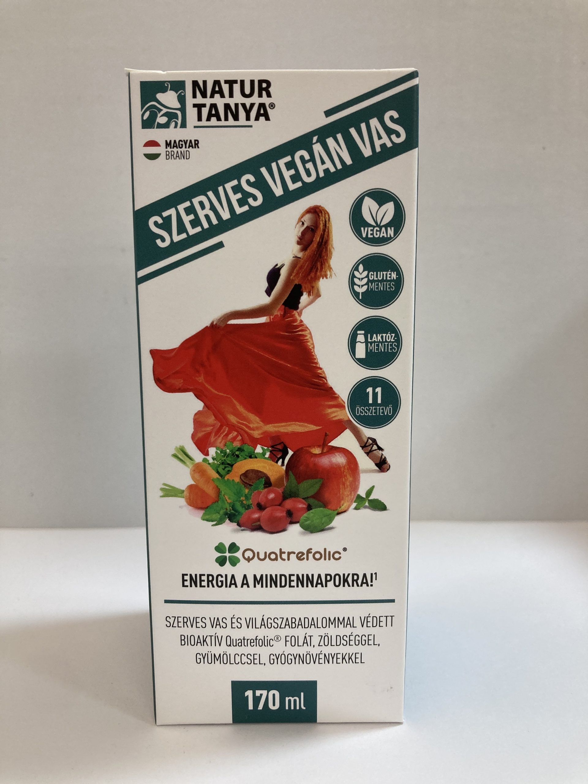 Szerves Vegán Vas szirup 11 összetevővel az energikus mindennapokért!A szerves vas mellett, világszabadalommal védett, bioaktív, 4. generációs Quatrefolic® folát, alma, spenót, vízitorma, sárgarépa, sárgabarack, csipkebogyó kivonat (és ebből nyert C-vitamin), nagy csalán, B12-vitamin és mangán található a koncentrátumban, steviával édesítve.