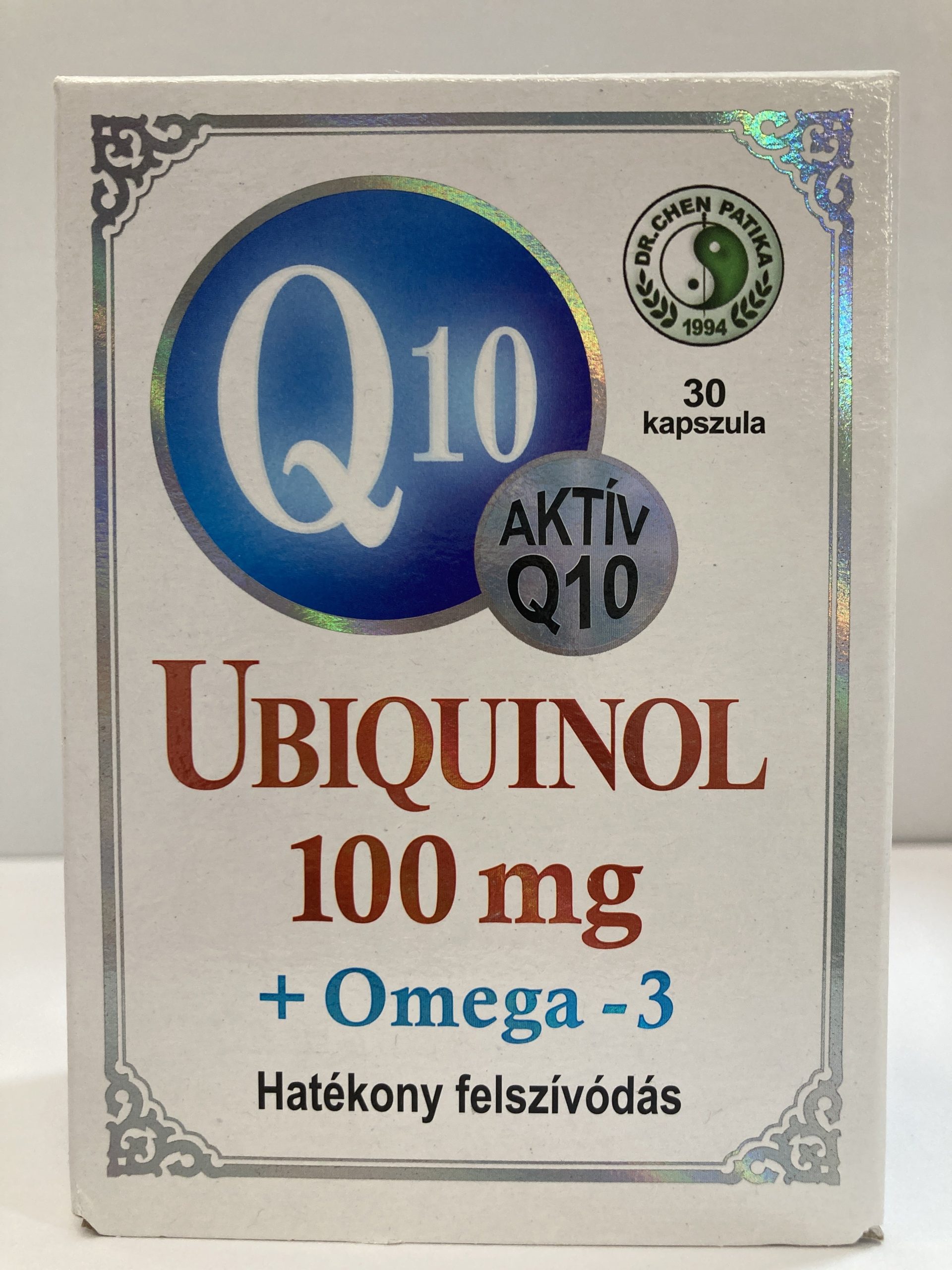 Nagy mennyiségű, kapszulánként 100 mg aktív koenzim Q10-et – a szervezet számára közvetlenül hasznosítható forma (ubiquinol QH), mely így hatékonyabban fejti ki hatását – és halolajat tartalmazó készítmény. A Q10 koenzim elektron hordozóként játszik szerepet az ATP termelésben (az ATP a sejtek központi energiaforrása). Rendszeres bevitele ajánlható fokozott fizikai és szellemi igénybevétel esetén is. Az E-vitamin védi a sejteket és a szöveteket a káros szabad gyökökkel szemben A halolajban található többszörösen telítetlen zsírsavak (EPA, DHA) hozzájárulnak a keringési rendszer (szív- és érrendszer) egészséges működéséhez. A Q10 koenzim antioxidáns tulajdonságánál fogva védheti a sejteket az oxidatív stressz ellen, mely a sejtek öregedéséért felelős. A megfelelő Q10 ellátottság hozzájárulhat a szív egészséges működéséhez, valamint a vérnyomás normál értékének fenntartásához. A Q10 koenzim jelentős fizikai és szellemi igénybevétel esetén támogathatja a szervezet energiaellátását. Az E-vitamin védelmet nyújthat a sejteket és a szöveteket számára a káros hatású szabad gyökökkel szemben. A többszörösen telítetlen zsírsavak hozzájárulhatnak a keringési rendszer egészséges működéséhez és csökkenthetik a vér koleszterin szintjét. A többszörösen telítetlen zsírsavakon belül az EPA és DHA (omega-3 zsírsavak) csökkenthetik a vér triglicerid szintjét. Adagolás: Napi 2 x 1 kapszula folyadékkal lenyelve. ÖSSZETEVŐK 1 KAPSZULÁRA: Mélytengeri halolaj 400 mg, zselatin, Q10 aktív formában 100 mg, E-vitamin (d-alfa-tokoferol)